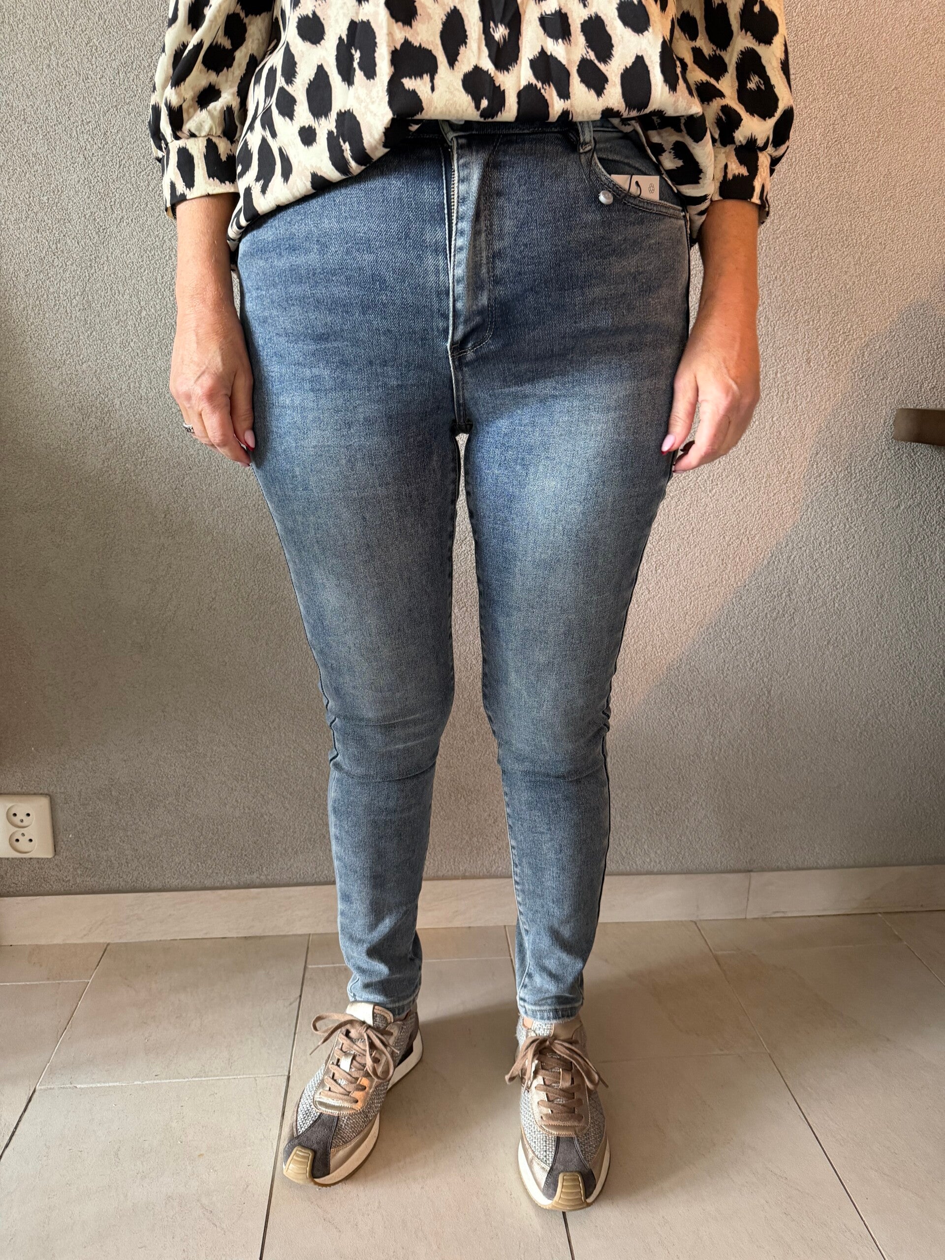 De jeans bevat stretch en valt op maat. beide modellen dragen maat L